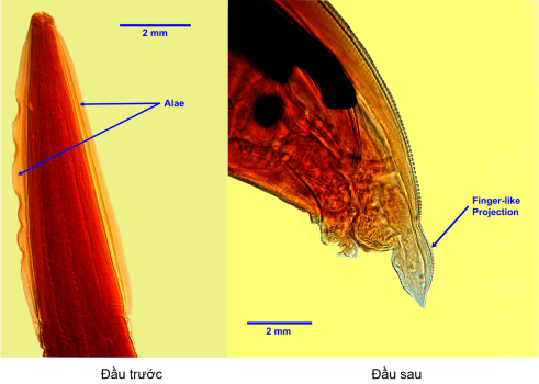 Giun trưởng thành: Con đực có kích thước 4 – 10 cm và con cái 6 – 18 cm. Hình dáng trông giống con giun đũa giai đoạn trẻ (young ascaris), có thể quan sát dễ dàng bằng mắt thường. Cả giun đực và giun cái đều có hai cánh cổ bên dài và hẹp, cùng với ba “môi” ở đầu trước. Giun đực có một mấu ngắn dạng ngón tay ở đầu sau.