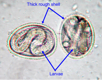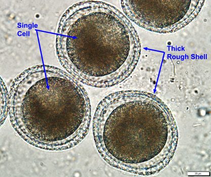 Trứng có kích thước khoảng 90 × 75 µm, hình bán thùy, vỏ dày, sần sùi, có hình ảnh đặc trưng giống “quả bóng golf”. Khi mới được thải ra ngoài, mỗi trứng chứa một hoặc hai tế bào.