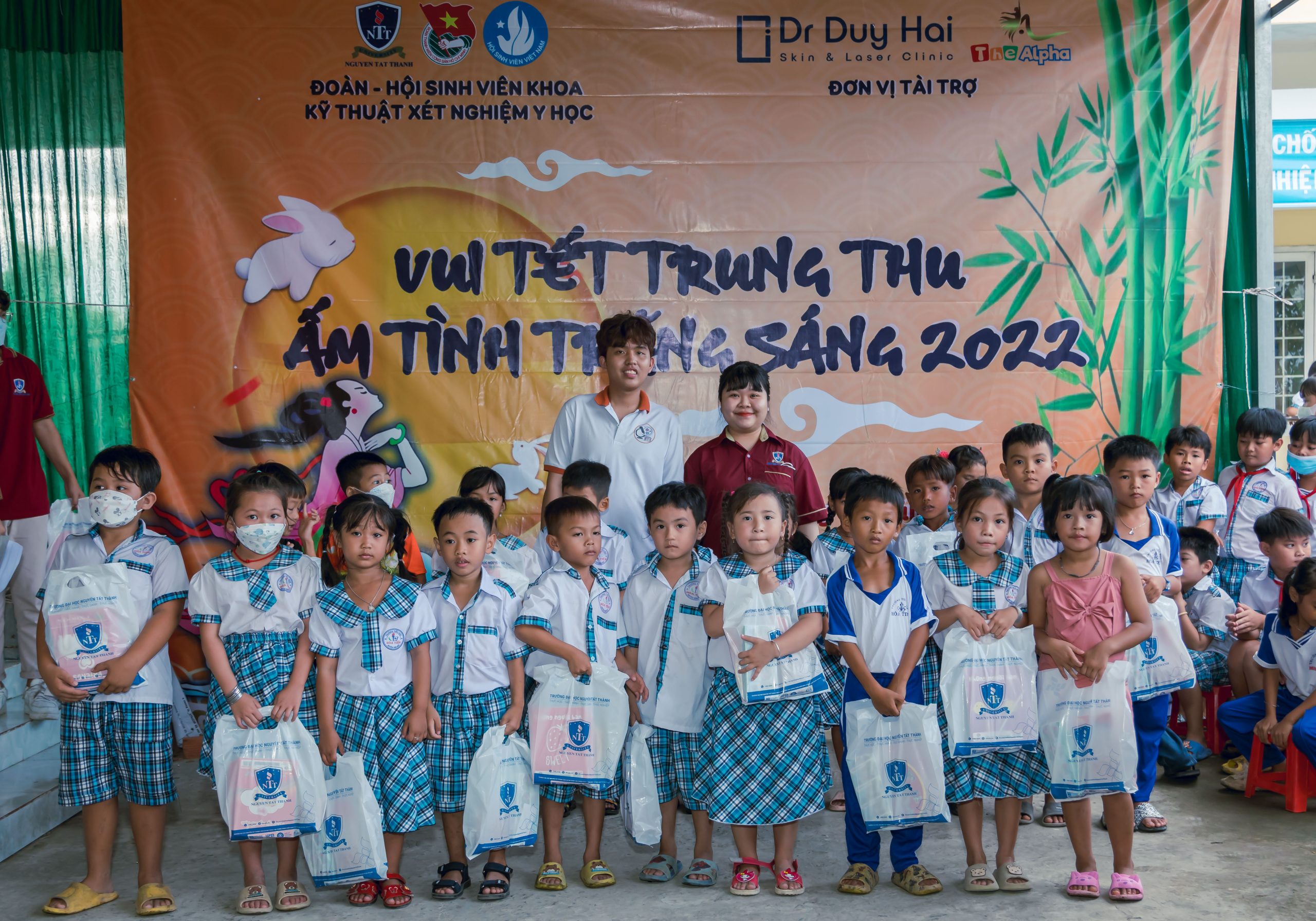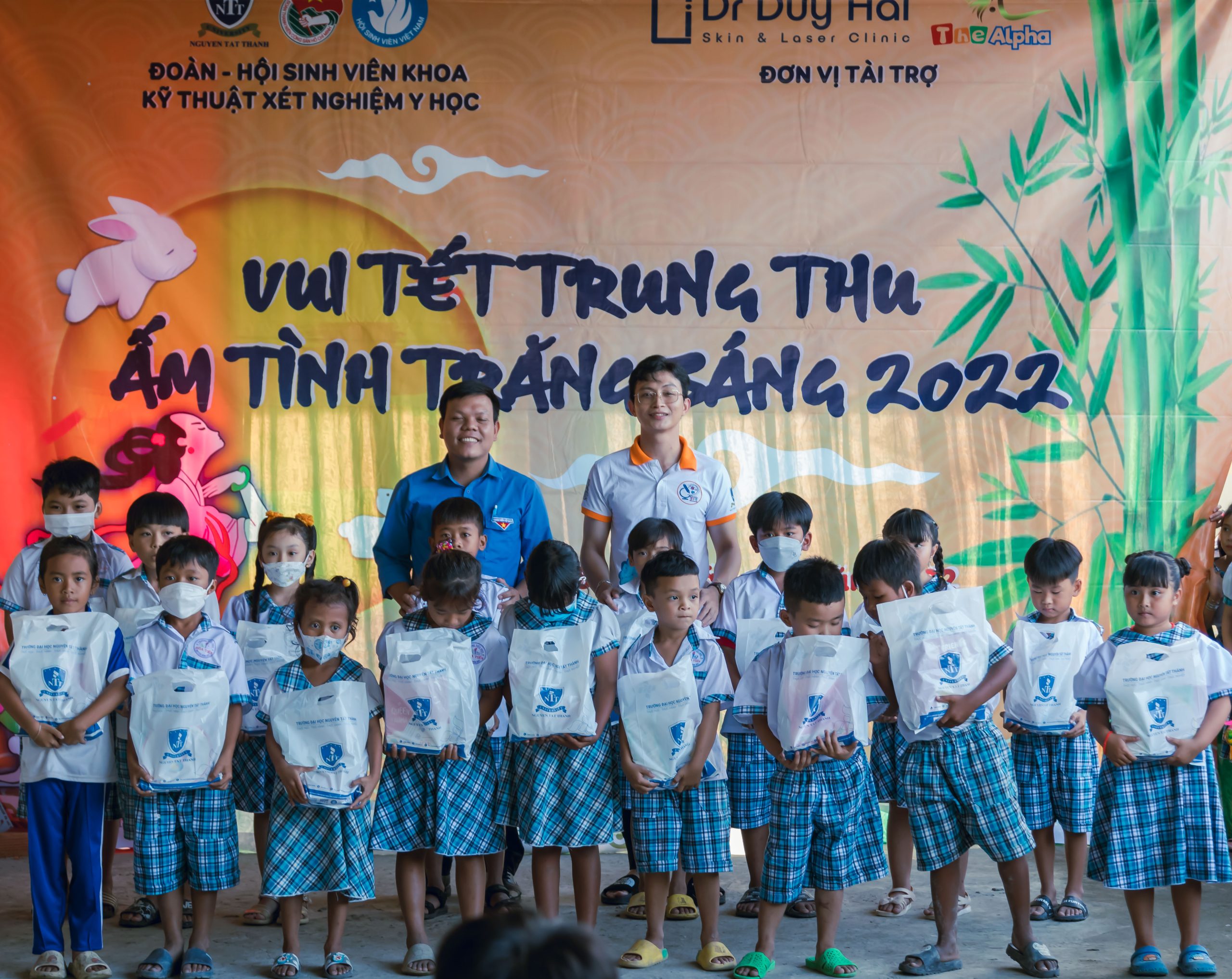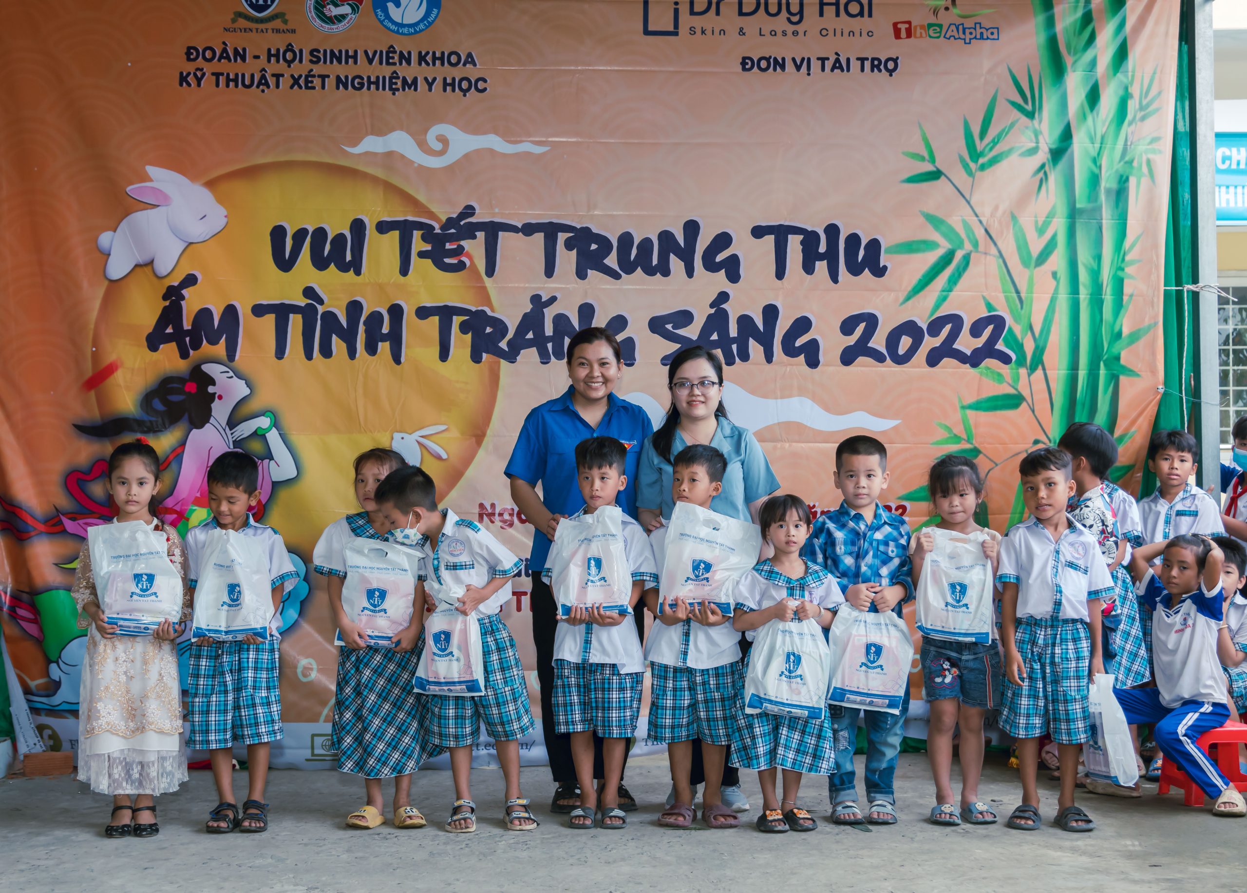 Chuyến đi với sự tham gia của ThS Nguyễn Hoàng Thảo My – Phụ trách đào tạo, Quyền trường Bộ môn Hóa sinh Khoa Kỹ thuật xét nghiệm y học, ThS Nguyễn Vân Hương, ThS Từ Minh Thành giảng viên Khoa Kỹ thuật xét nghiệm y học, Thầy Nguyễn Duy Thống Kỹ thuật viên và Cô Hà Mỹ Nhân Giáo vụ Khoa, đại diện của nhà tại trợ Trung Tâm Năng Khiếu AlphaKids và cùng với sự tham gia của hơn 30 sinh viên Khoa Kỹ thuật xét nghiệm y học và các Khoa khác của trường Đại học Nguyễn Tất Thành , đoàn đã cùng nhau tổ chức chương trình “Vui Tết Trung Thu – Ấm Tình Trăng Sáng” cho các em học sinh của Trường Tiểu học Hòa Tiến, xã Nam Thái Sơn, huyện Hòn Đất, tỉnh Kiên Giang.