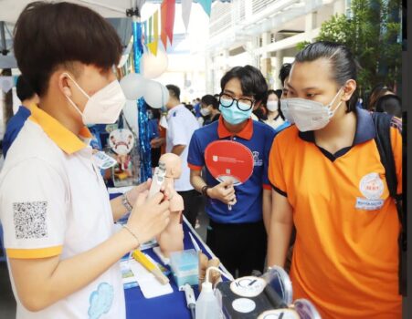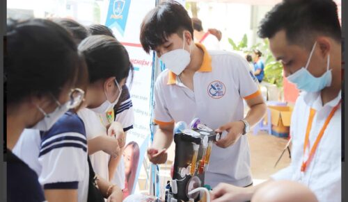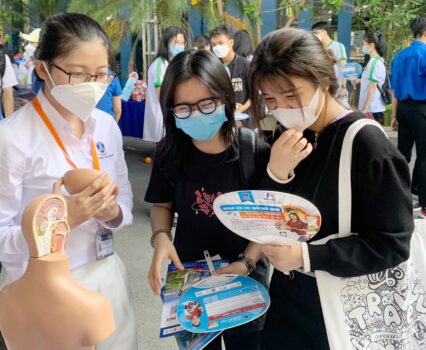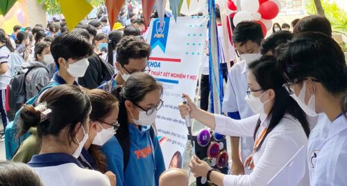 Đến với gian hàng tư vấn tuyển sinh của Khoa Kỹ thuật xét nghiệm y học, các em còn được trải nghiệm thực hiện các xét nghiệm sinh hoá, mô hình nuôi cấy vi khuẩn in vitro, mô hình giải phẫu cơ thể người, tìm hiểu các xét nghiệm nhóm máu. Dù chỉ là những thao tác cơ bản, những mô hình tượng trưng, nhưng phần nào cũng giúp các em hiểu rõ hơn về ngành Kỹ thuật xét nghiệm y học từ đó các em có hình dung chân thật, sinh động về các ngành, nghề, giúp ích cho việc định hướng và lựa chọn nghề nghiệp tương lai.