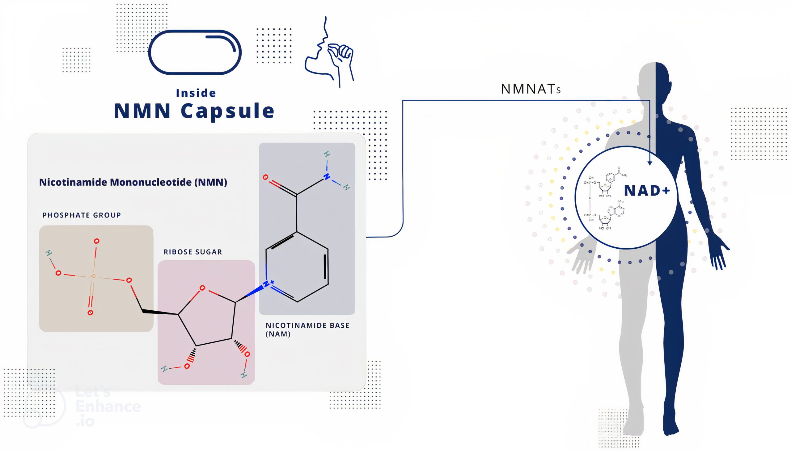 Nicotinamide mononucleotide (NMN) tồn tại ở dạng đồng phân anomer a và b thường được gọi là nicotinamide ribotide, nicotinamide-1-ium-1-b-D-ribofuranoside-5’-phosphate, b-nicotinamide ribose monophosphate và 3-carbamoyl-1-[5-O-(hydroxyphosphinato)-b-D-ribofuranosyl] pyridinium, v.v… Dạng b là anomer hoạt động và NMN có cấu trúc tự nhiên là kết quả của phản ứng, được xúc tác bởi enzyme nicotinamide phosphoribosyltransferase, giữa một nhóm phosphate với một nucleoside có chứa nicotinamide (một dạng amide của vitamin B3) và ribose. NMN là một nucleotide hoạt tính sinh học có gốc pyridin và trọng lượng phân tử của nó là 334,22 g/mol. NMN tan được trong nước với độ hoà tan 1,8 mg/mL và có tính acid yếu.