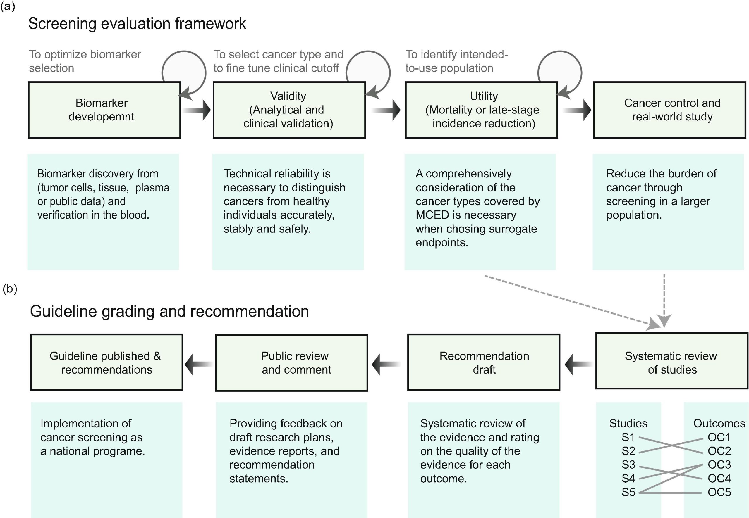 (b) Nếu xét nghiệm MCED được các cơ quan quản lý phê duyệt, bước tiếp theo là xây dựng khuyến nghị và phân loại hướng dẫn (guideline recommendation and grading) nhằm triển khai và mở rộng việc sàng lọc MCED ra cộng đồng dân số rộng hơn.