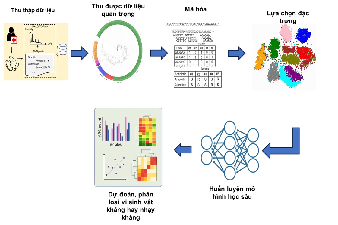 Hình 2.Quy trình tổng thể áp dụng các mô hình học máy (ML) học sâu (DL) trong nhận diện AMR (kháng kháng sinh)