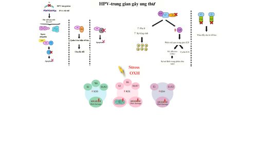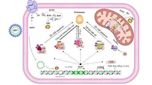 Các protein HPV E6 và E7 là những oncoprotein chính gây ung thư. E6 ức chế protein p53 (chất ức chế khối u) và các protein khác, ngăn chặn apoptosis và làm tăng khả năng sao chép DNA của vi-rút. E7 ức chế protein pRb, một chất ức chế chu kỳ tế bào, dẫn đến sự tăng tốc của chu kỳ tế bào và sự sao chép DNA không kiểm soát. Cả E6 và E7 đều góp phần vào sự bất tử của tế bào và sự phát triển ác tính. Protein E5 cũng có thể tham gia vào quá trình gây ung thư bằng cách ảnh hưởng đến sự tăng sinh và biệt hóa tế bào. E4 tham gia vào giải phóng vi-rút từ tế bào. Tóm lại, nhiễm trùng HPV gây ung thư thông qua các cơ chế phức tạp liên quan đến sự mất kiểm soát chu kỳ tế bào, ức chế apoptosis và phá vỡ các cơ chế kiểm soát tế bào thông qua các oncoprotein như E6, E7 và E5 (Hình 1).